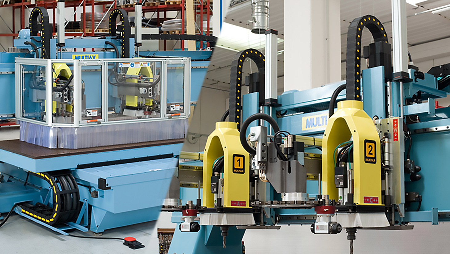 When required in 5-axis configuration it is called F SERIES, so the M SERIES is limited to 3-4 axis. Depending on the specific application, the table(s) can be equipped with many different types of surfaces and clamping systems (phenolic vacuum, aluminum, T-slots inserts/steel, rails/pods/vices, additional lathes, special solutions, etc.). The spindle heads and Automatic Tool Changers can be different in function of the materials and the expected performances. Multiple spindles can work as a single unit, on the same slide, or independently (Multiax Independent Cutting Units) with twin independent process. In this case is like having two single table machines, producing independently one different (or identical) part on each table, at the same time. These configurations enable incredible productivity.