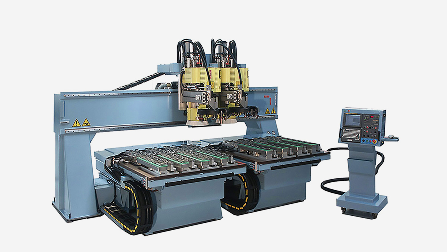 When required in 5-axis configuration it is called F SERIES, so the M SERIES is limited to 3-4 axis. Depending on the specific application, the table(s) can be equipped with many different types of surfaces and clamping systems (phenolic vacuum, aluminum, T-slots inserts/steel, rails/pods/vices, additional lathes, special solutions, etc.). The spindle heads and Automatic Tool Changers can be different in function of the materials and the expected performances. Multiple spindles can work as a single unit, on the same slide, or independently (Multiax Independent Cutting Units) with twin independent process. In this case is like having two single table machines, producing independently one different (or identical) part on each table, at the same time. These configurations enable incredible productivity.